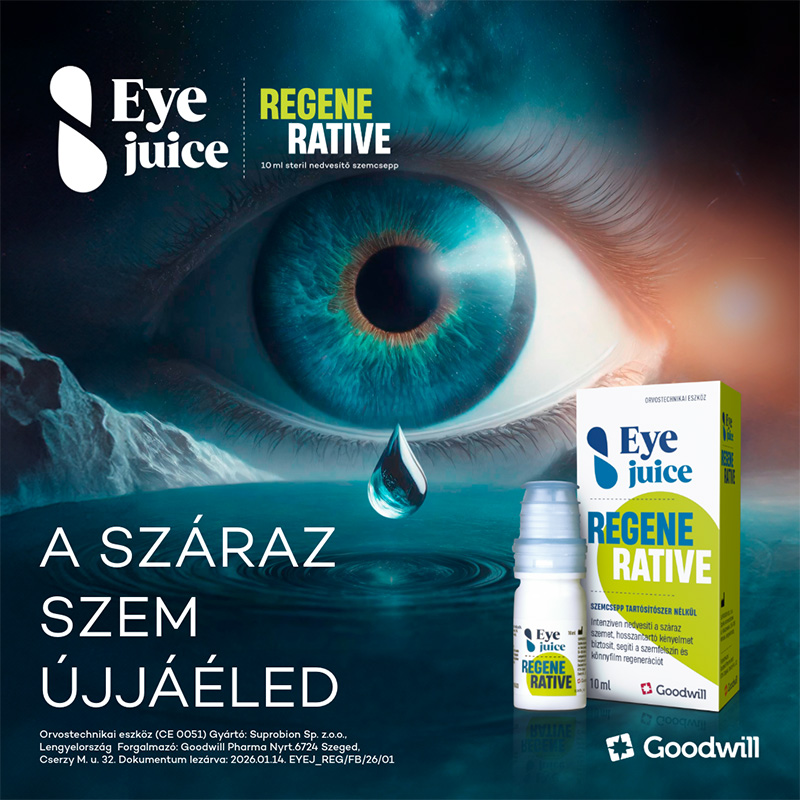Az Eyejuice Regenerative szemcsepp orvostechnikai eszköz intenzíven és hosszantartóan nedvesíti a szemet, csökkenti a szemszárazság tüneteit. Stabilizálja a könnyfilmet, segíti a szemfelszín regenerációját.