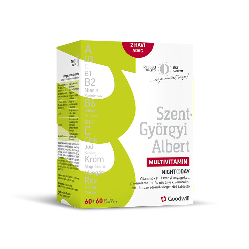 Szent-Györgyi Albert Multivitamin – vitaminokat, ásványi anyagokat és nyomelemeket és növényi kivonatokat tartalmazó étrend-kiegészítő tabletta. Hatóanyagai hozzájárulnak a friss nappalokhoz és a nyugodt éjszakákhoz. A készítmény az ásványi anyagokat és a nyomelemeket előnyösen, szerves só formájában tartalmazza.